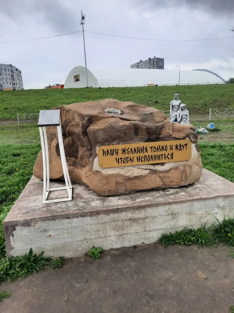 «Камень мы привезли из Екатеринбурга. Деньги на установку, монтаж — более 400 тысяч рублей — все за счет неравнодушных людей, предпринимателей, которым хотелось сделать что-то для города. В создании объекта участвовало около десяти человек. Идея камня — верить, что все желания сбываются, поэтому на нем установлена надпись: „Ваши желания только и ждут, чтобы исполниться“. Нужно лишь приложить руку и сердцем загадать желания», — рассказали корреспонденту URA.RU супруги Любовь и Андрей Останины, одни из авторов проекта.
