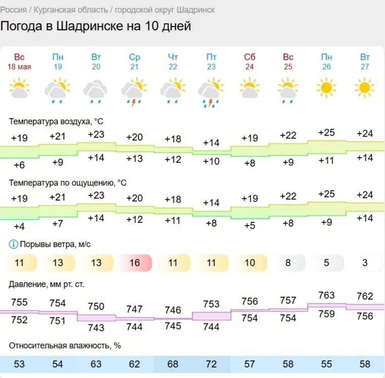 В Шадринске в ближайшие десять дней ожидается ветреная и дождливая погода с грозами. Об этом сообщается на сайте Gismeteo.