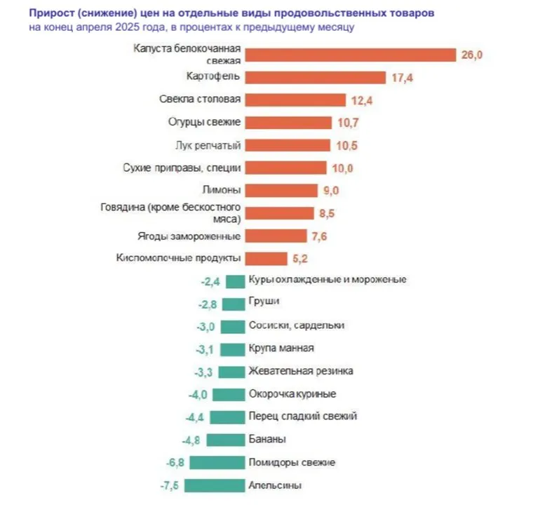 «Капуста белокочанная подорожала на 26%. Цена картофеля поднялась на 17,4%, а огурцов на 10,7%. Апельсины подешевели на 7,5%, а помидоры на 6,8%. Бананы, перец и окорочка упали в цене на 4%», — написано в данных Свердловскстата.
