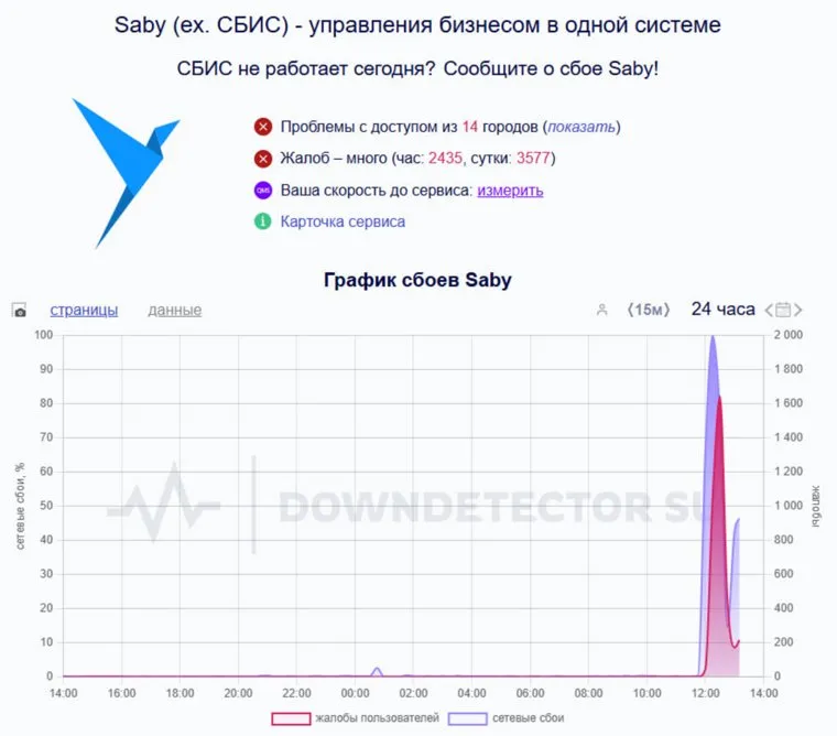 «Saby — всплеск сообщений о проблемах в работе сервиса», — сообщил Downdetector. По предварительным данным, сбой затронул порядка четырех миллионов пользователей по всей стране.