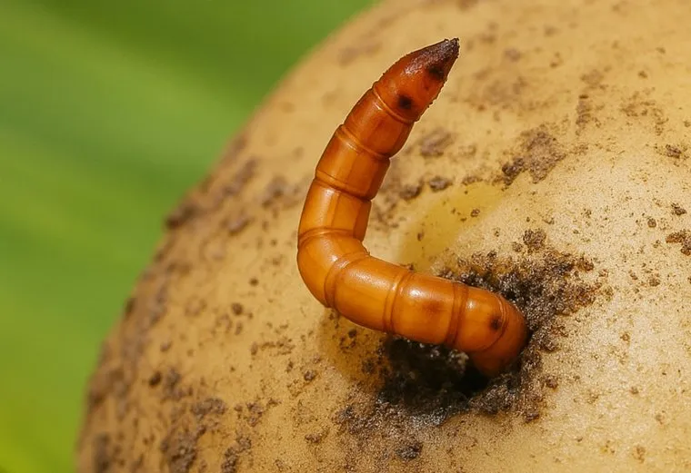 Еще один опасный вредитель, часто остающийся незамеченным до самого сбора урожая, — проволочник, личинка жука-щелкуна. Пока картофель не выкопан, о его присутствии можно и не догадаться. А потом — клубни изрыты ходами, полны мелких отверстий: чистить трудно, хранить невозможно.
