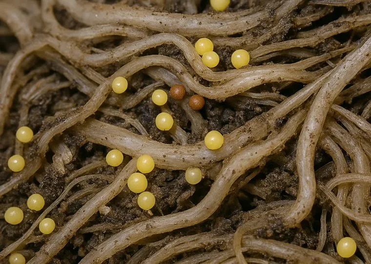 Если картофель заражен нематодой, это видно невооруженным глазом. Куст развивается слабо, заметно отстает в росте по сравнению со здоровыми растениями. Листья, начиная с нижних, желтеют, вянут и преждевременно опадают. При выкопке таких кустов на корнях можно обнаружить мелкие желтоватые образования — это цисты с личинками золотистой картофельной нематоды, микроскопического червя-паразита, поражающего корневую систему.