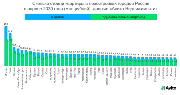 При этом дешевле всего в апреле 2025 года новое жилье стоило в Липецке (101 тысяча рублей за квадратный метр), Ставрополе и Смоленске (по 102 тысячи рублей), Ярославле (105 тысяч рублей), Калуге (106 тысяч рублей) и Брянске (107 тысяч рублей). Самая дорогая стоимость квадратного метра отмечена в Сочи (503 тысячи рублей за квадрат), Москве (433 тысячи рублей), Санкт-Петербурге (246 тысяч рублей), Казани (231 тысяча рублей).