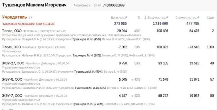 Основным активом Комякова и его пасынка Максима Тушенцова является теплоэнергетическое ООО «Тэсис», дела которой давно оставляют желать лучшего. В отличие от ООО «Центр» аналогичного профиля — с выручкой более 200 млн рублей и стоимостью бизнеса в 102,6 млн рублей. Также Тушенцов ведет совместный коммунальный бизнес с Владимиром Ветховым, отцом действующего депутата гордумы Кирилла Ветхова.