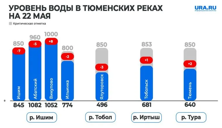 В г. Ишим Тюменской области уровень воды в одноименной реке опустился ниже отметки «Опасное явление», и по данным на 22 мая составил 845 сантиметров. Об этом в своем telegram-канале сообщил глава региона Александр Моор.