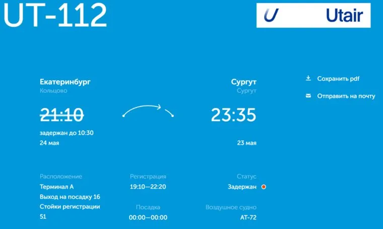 Авиарейс из Екатеринбурга в Сургут задержан более чем на 12 часов. Скрин