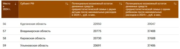 В Курганской области у семьи с двумя детьми возможный остаток денег после минимальных расходов составил в среднем за 2024 год сумму — 20 950 рублей в месяц. У семей с одним ребенком этот показатель равен в среднем — 39 047 рублей, отмечается в рейтинге.