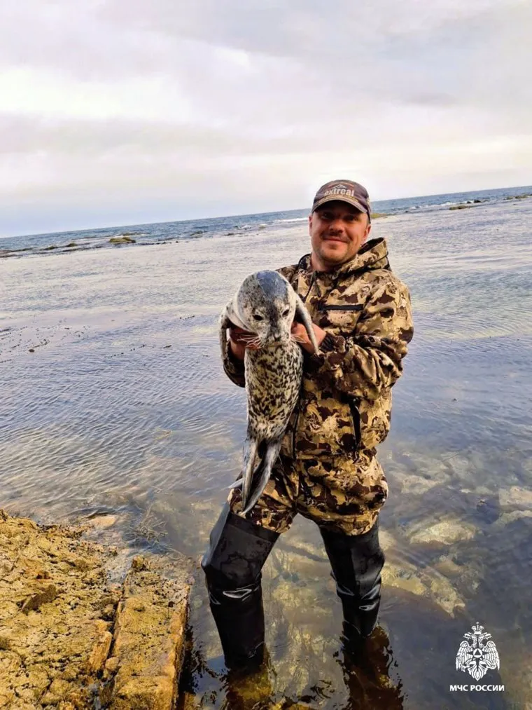 «Спасатель МЧС России Руслан Бородин, находясь в свободное от службы время с друзьями на рыбалке, наткнулся на истощенного тюленя», — написало ведомство в своем telegram-канале. Там добавили, что Руслан перенес детеныша в прохладное помещение своего дома, где укрыл и напоил.