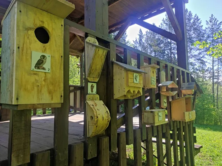 Кстати, скворечник скворечнику — рознь. Для разных видов птиц орнитологи строят разные виды домиков. Все можно увидеть на одной из сторон специальной вышки для наблюдения за птицами, которая есть на Липовой горе. Среди «скворечников» здесь представлен даже дом для летучих мышей.