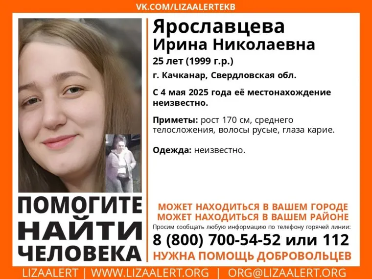 В городе Качканар (Свердловская область) пропала 25-летняя Ирина Ярославцева. Ее местоположение неизвестно с 4 мая, сообщили в поисковом отряде «ЛизаАлерт».