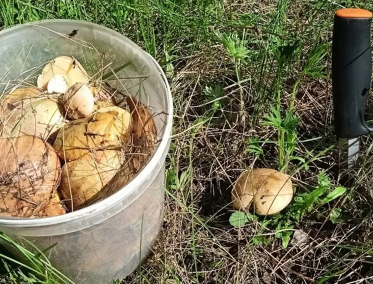 Мужчина смог собрать целое ведро молодых грибов