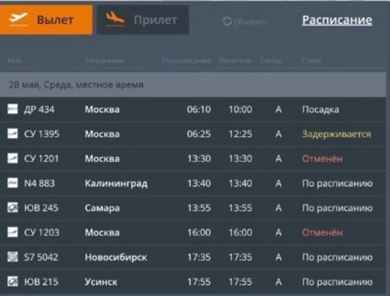 «Так, отменены рейсы „Аэрофлота“ СУ-1657 и СУ-1201. Они должны были отправиться в московский аэропорт Шереметьево», — об этом свидетельствуют данные на онлайн-табло пермского аэропорта.
