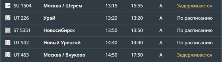 «Рейс SU 1504 Москва/ШРМ — Тюмень. Прибытие по расписанию — 15:15, статус — задерживается. Рейс UT 463 Москва/ВНК — Тюмень, прибытие по расписанию — 14:50, статус — задерживается», — указано на табло.