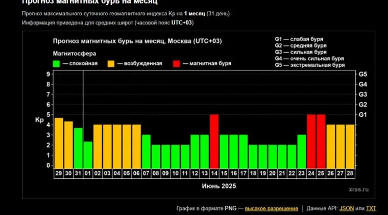 - 14 июня — сильная буря. Ровно на один день прогнозируется полноценная геомагнитная буря: «красный уровень», пять баллов. В этот день стоит быть особенно внимательными к самочувствию.