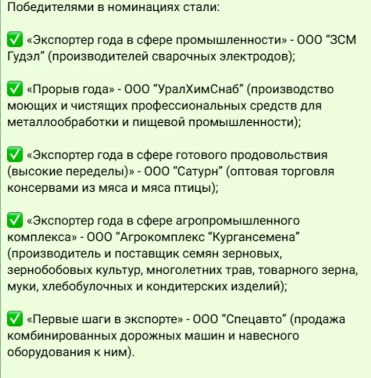 Также прошел ежегодный конкурс «Экспортер года». В нем приняли участие 50 предприятий из Кургана и районов области. В числе победителей — компании, работающие в сфере производства сварочных электродов, моющих средств для промышленности, консервов из мяса птицы, семян и хлебобулочных изделий, а также дорожно-строительной техники.