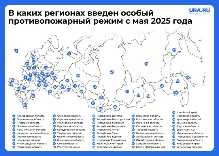 На конец мая 2025 года особый противопожарный режим введен в 51 российском регионе. В частности, в Свердловской, Челябинской, Омской, Липецкой, Воронежской, Иркутской областях. Также он действует в Пермском, Краснодарском крае, в Бурятии, Ханты-Мансийском автономном округе.