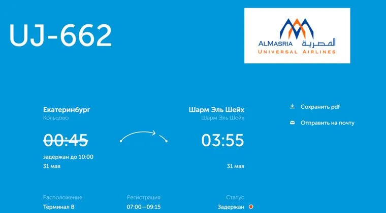 В Кольцово более чем на девять часов перенесли рейс египетской авиакомпании AlMasria Universal Airlines до Шарм-Эль-Шейха. Информация об этом появилась на онлайн-табло аэропорта.