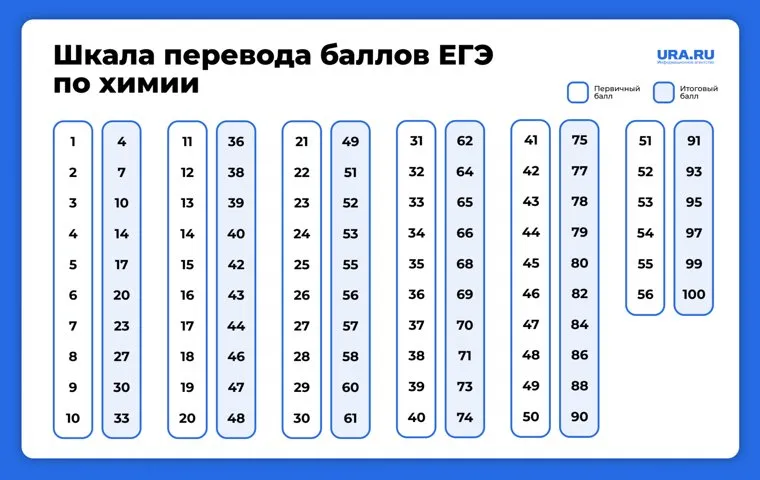 Минимальный проходной балл по ЕГЭ по химии составит 36 баллов. Для абитуриентов, поступающих в высшие учебные заведения, подведомственные Минобразованию, установлен более высокий порог — не менее 39 баллов. Максимально за выполнение всех заданий экзаменационной работы, включая безошибочное выполнение тестовой части и решение всех задач, можно получить 56 первичных баллов.