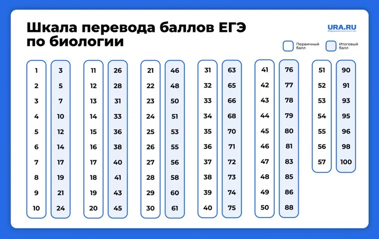 Минимальный пороговый балл ЕГЭ по биологии составит 36, а для поступления в высшие учебные заведения, находящиеся в ведении Минобрнауки, потребуется не менее 39 баллов. Экзаменационная работа включает тестовую часть и задания с развернутыми ответами. Наивысший возможный результат по первичной шкале — 57 баллов.