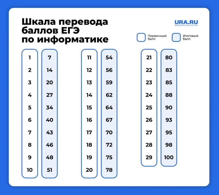 В 2025 году установлен минимальный порог для успешного прохождения экзамена по информатике — 40 баллов. Для абитуриентов, планирующих поступление в высшие учебные заведения, подчиненные Министерству образования, требуется набрать не менее 44 баллов. Экзаменационные задания предусматривают только краткие ответы, а наивысшее возможное количество первичных баллов составляет 29.