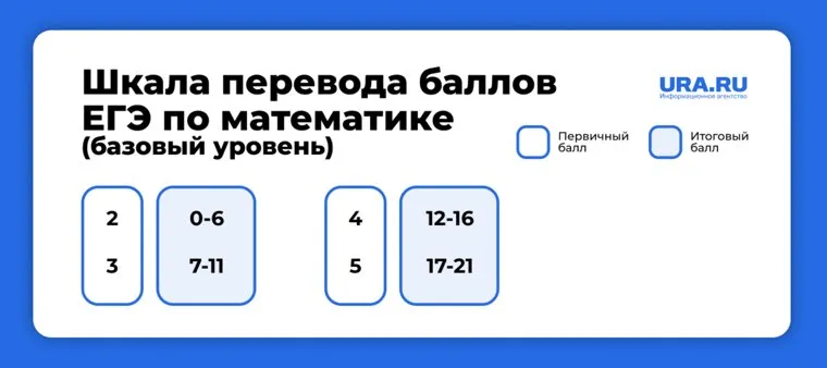 Базовый уровень экзамена по математике не предусматривает оценивание по стобалльной системе, а его результаты не принимаются при поступлении в высшие учебные заведения. Экзамен считается успешно сданным при наборе не менее семи первичных баллов. Такой результат дает право на получение аттестата о среднем общем образовании и поступление на все направления высшего образования, для которых экзамен по математике не является обязательным. Максимальное количество первичных баллов на этом экзамене составляет 21.