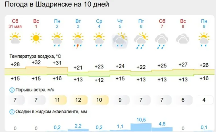 «С 10-го мая по 9 июня в Шадринске обещают дожди, а также грозы. Днем ожидается от 21 до 32 градусов тепла, ночью от +12 до +16 градусов», — сообщается на сайте Gismeteo.