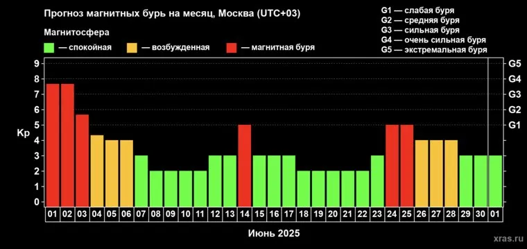 Также магнитные бури прогнозируют в конце месяца: 24-25 июня ученые ожидают «красный» уровень магнитосферы, а затем в течение трех дней геомагнитная активность останется возбужденной. Стоит учитывать, что прогнозы на такой длительный срок могут оказаться неточными, поэтому метеозависимым людям лучше регулярно проверять, чего ждать от магнитосферы в ближайшие дни.