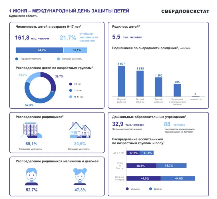 «В Курганской области каждый третий ребенок родился в многодетной семье — всего 1200 детей за январь-декабрь 2024 года. Четвертый и последующий ребенок в семье — 785. Кроме того, мальчиков (52,7%) родилось больше, чем девочек (47,3%).Численность детей составила 161,8 тысяч. Это 21,7% от общего числа жителей Курганской области. Большинство детей живет в городской местности — 69,1%, когда в селах проживает 30,9%», — приводит статистику Свердловскстат.