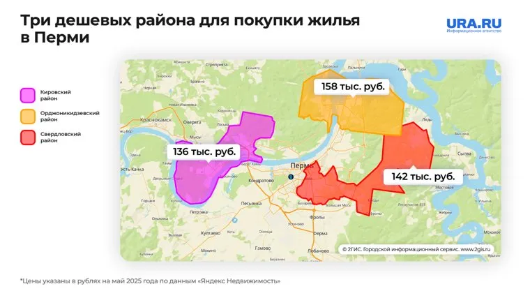 В мае 2025 года самые дешевые новостройки в Перми продавались в Кировском районе. Также в топ-3 бюджетных микрорайонов вошли Свердловский и Орджоникидзевский, рассказали URA.RU в пресс-службе «Яндекс Недвижимости».