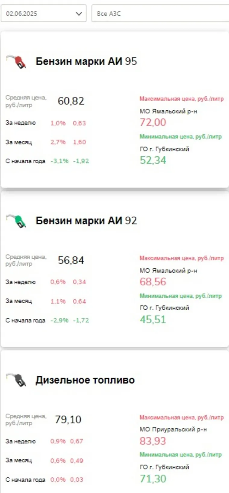 «Мониторинг розничных цен на нефтепродукты за неделю с 26 мая по 1 июня 2025. Бензин марки АИ-95 — средняя цена за литр составляет 60,82 рубля, рост показателя на 1,0%», — сообщается на портале ИАС «Мониторинг Ямал». Также вырос в цене и бензин марки АИ-92. Его средняя стоимость за неделю увеличилась на 0,6% и составила 56,84 рубля за литр. Дизельное топливо подорожало на 0,9% и на 2 июня стоит 79,10 рубля за литр.