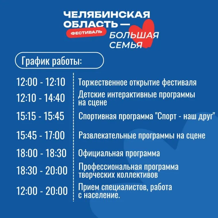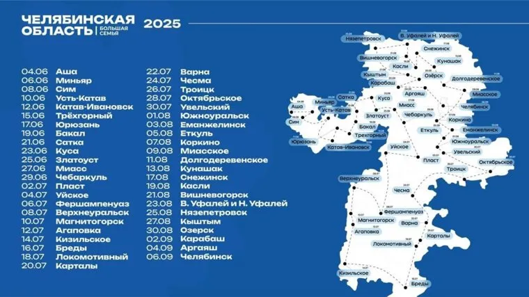 В Челябинской области стартует фестиваль «Челябинская область — большая семья». В 46 городах и селах региона фестиваль посетят заместители губернатора, министры и заместители министров, — сообщается на сайте фестиваля.