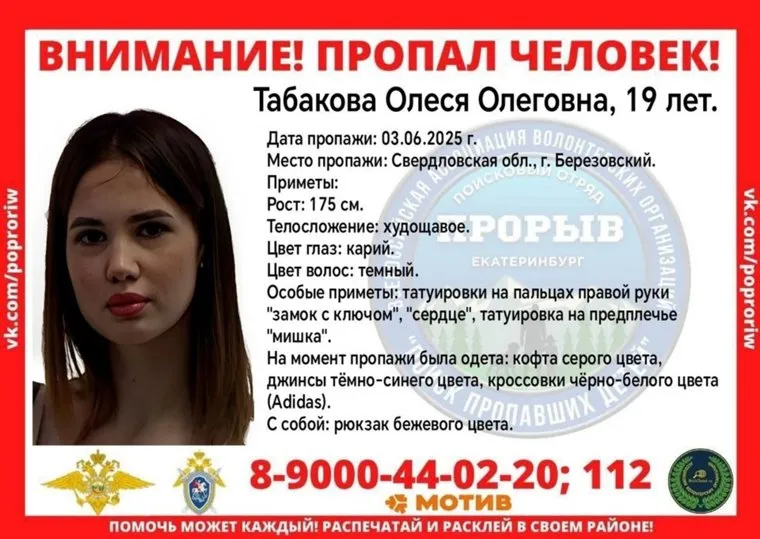 В Березовском (Свердловская область) пропала 19-летняя Олеся Табакова. О местонахождении девушки ничего неизвестно с вечера 3 июня. Ориентировку обеспокоенные местные жители опубликовали в социальных сетях.