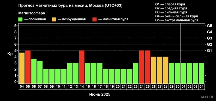 По прогнозам ученых, утром 5 июня произойдет резкий всплеск геомагнитной активности. Примерно в 6 утра по московскому времени уровень магнитосферы Земли поднимется до «красных» значений, после чего начнет снижаться. Вероятность магнитной бури ученые оценивают в 50%. Возможность слабых геомагнитных возмущений — в 30%. Шанс того, что магнитосфера Земли останется спокойной — всего 20%.