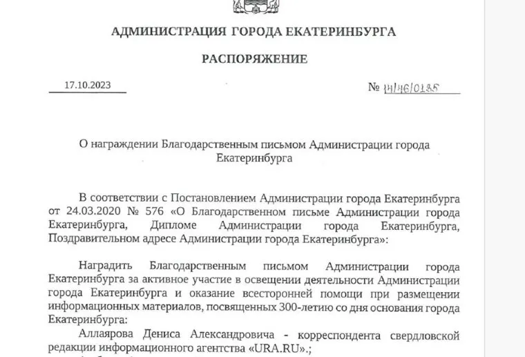 Распоряжение Администрации г. Екатеринбург о награждении журналиста Дениса Аллаярова