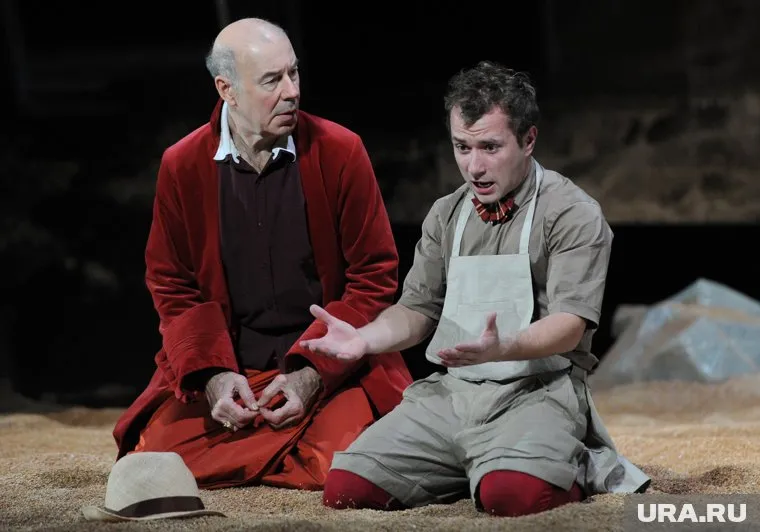 Актеры Михаил Янушкевич (Гермократ) и Александр Якин (Димас) в сцене из спектакля «Триумф любви» по пьесе Пьера Карле де Мариво режиссера Галина Стоева в Театре Наций