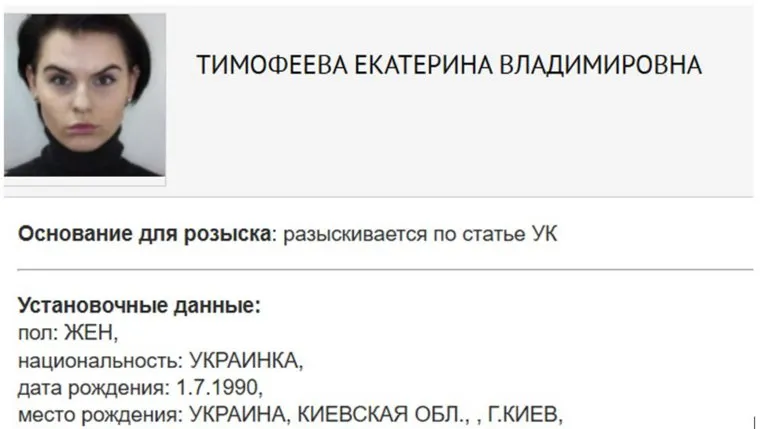 «Разыскивается Тимофеева Екатерина Владимировна. Основание для розыска: разыскивается по статье УК. Установочные данные: пол — женский; национальность — украинка; дата рождения: 01.07.1990; место рождения — Украина, Киевская область, Киев», — говорится в карточке.