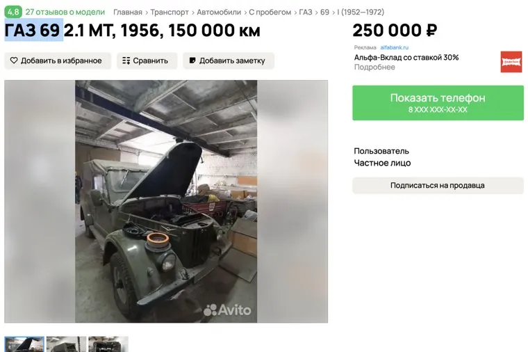 Фото: скрин с сайта «Авито» https://www.avito.ru/chebarkul/avtomobili/gaz_69_2.1_mt_1956_150_000_km_7310692186