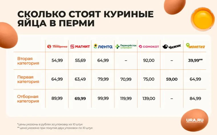 В Перми магазины снизили цены на куриные яйца. Стоимость десятка начинается от 39,99 рубля. За такую стоимость продают яйца второй категории. Корреспондент URA.RU прошелся по пермским магазинам, и выяснил, где выгоднее покупать куриные яйца.