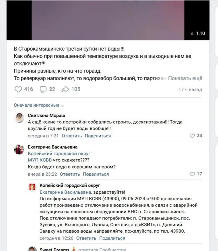Посты от людей размещены сразу в нескольких группах, под некоторыми есть ответ от администрации Копейского городского округа, но с грубой фактической ошибкой — дата отключения воды указана 9 июня 2024 года. «09.06.2024 с 9:00 до окончания работ произведено отключение водоснабжения, в связи с аварийной ситуацией на насосном оборудовании ВНС поселка Старокамышинск. Под отключение попадают потребители: п. Старокамышинск, пос. Зуевка, ул. Высоцкого, Лунная, Светлая, з-д „КЗИТ“, п. Дальний», — сообщила пресс-служба мэрии Копейска в группах «Типичный Старокамышинск» и «Текслер, ПОМОГИ!!!».