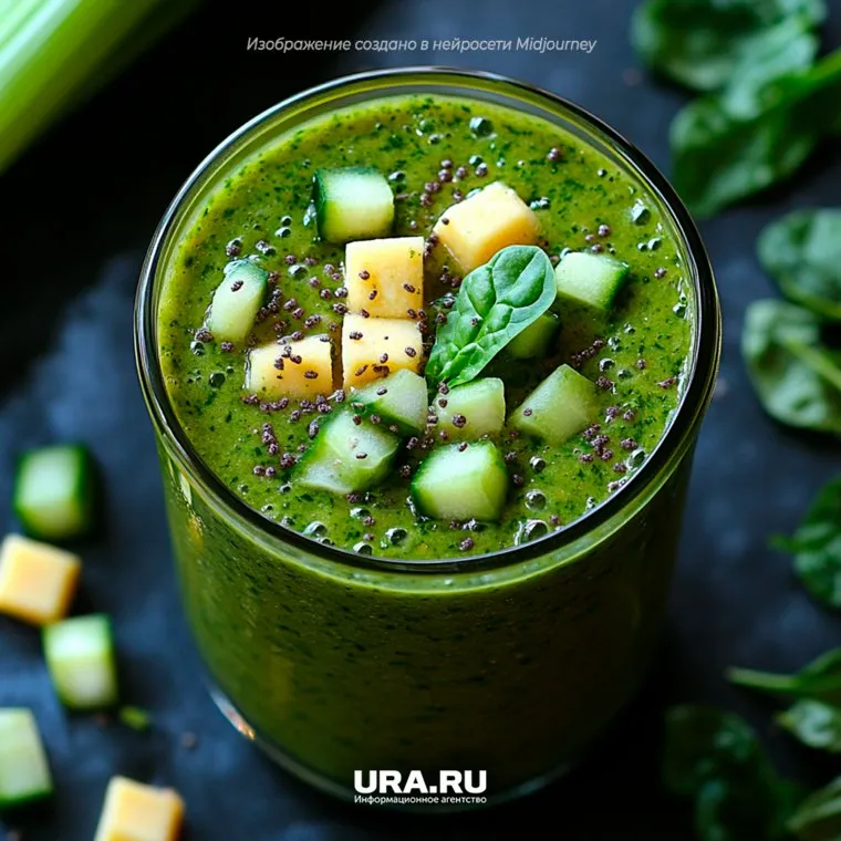 Попробуйте смузи и при необходимости добавьте еще воды или специй по вкусу. Смузи следует подавать сразу после приготовления. Напиток можно украсить веточкой зелени или долькой огурца для украшения.