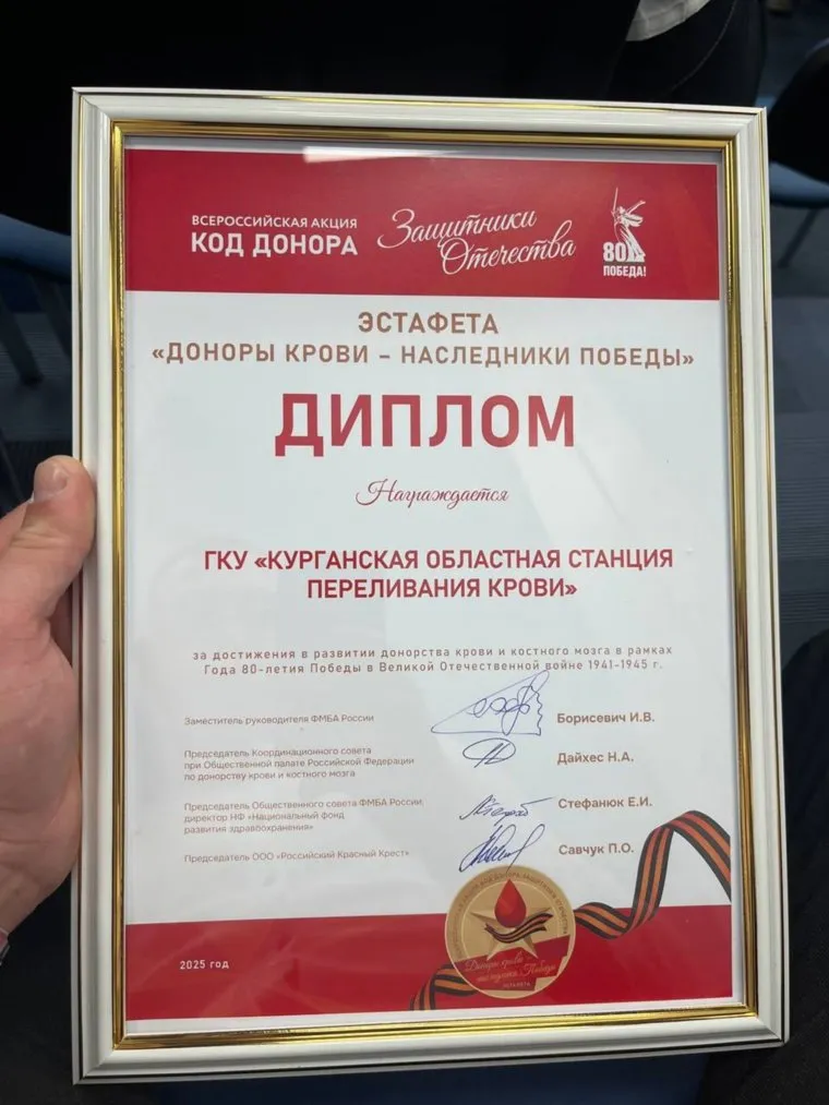 «Курганская областная станция переливания крови отмечена за достижения в развитии донорства крови и донорства костного мозга в рамках года 80-летия Победы и награждена памятной наградой. Акция „Код донора. Защитники Отечества“ приурочена к Году защитника Отечества», — отметили в Курганской областной станции переливания крови в социальной сети «ВКонтакте».