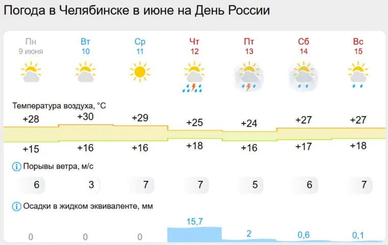 «До 11 июня в Челябинске ожидается жара с температурой 28-30 градусов. С 12 июня начнется сильная гроза, выпадет свыше 15 мм осадков. Гроза продлится двое суток, дожди продолжатся до 14 июня с туманами и ветром до семи метров в секунду», — уточнили на сайте.
