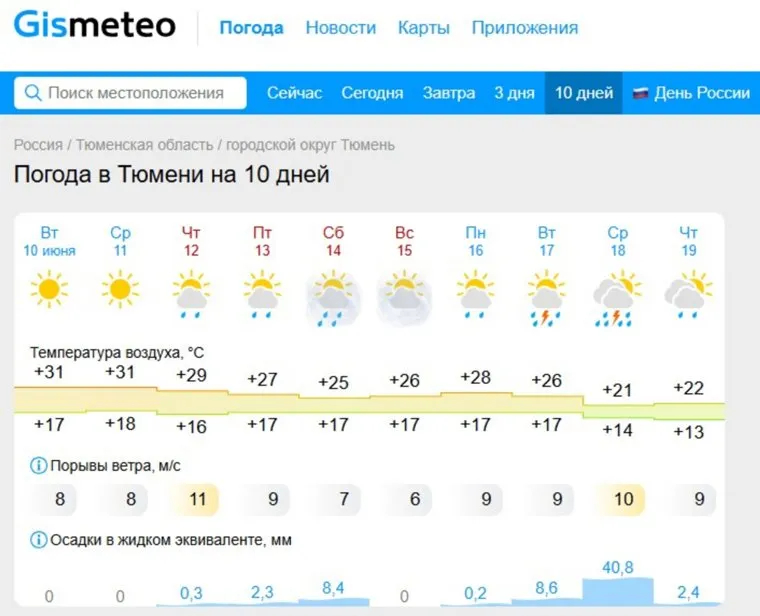 В Тюмени после затяжной жары пройдут ливни с грозой. Такой прогноз на следующие 10 дней дает метеорологический ресурс Gismeteo.