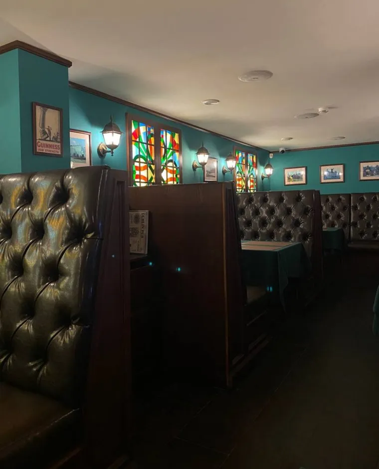 Ирландский бар остался на прежнем месте, в торговом центре «Невский». Фасад здания не изменился. Интерьер внутри паба освежили, но стиль выдержали: стены покрасили бирюзовой краской, диваны с высокими спинками перетянули кожей, мозаику на окнах очистили от многолетнего слоя пыли. В зоне, где раньше был настольный футбол, появились плакаты хоккеиста Александра Овечкина и экс-бойца ММА Хабиба Нурмагомедова.