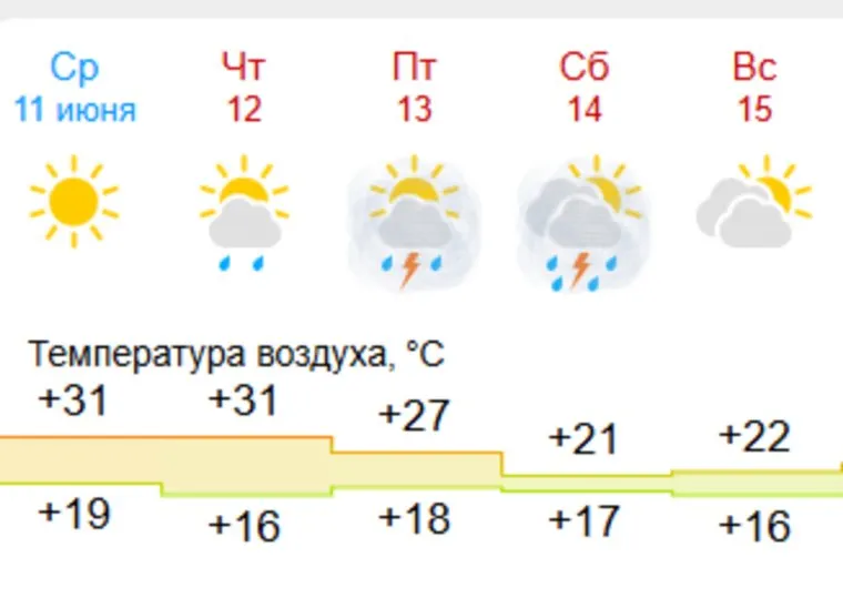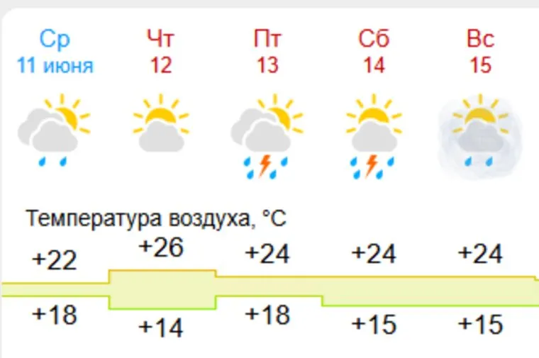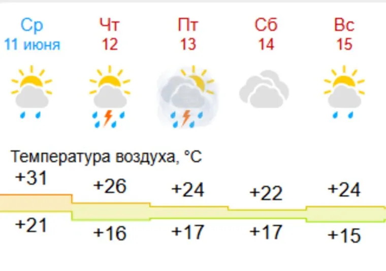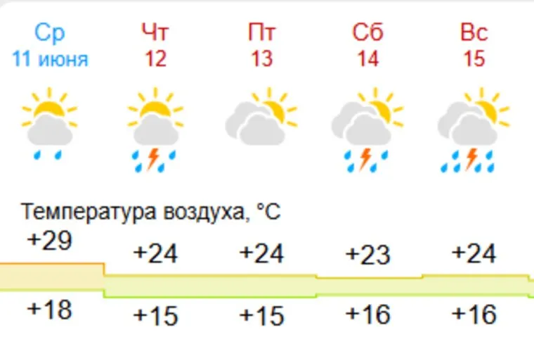Если в День России синоптики фиксировали аномально-теплую погоду, то уже в пятницу жара начнет постепенно спадать — до +27. В субботу, 14 июня, температура воздуха составит +21 градус тепла. Также в выходные дни ожидаются грозы.