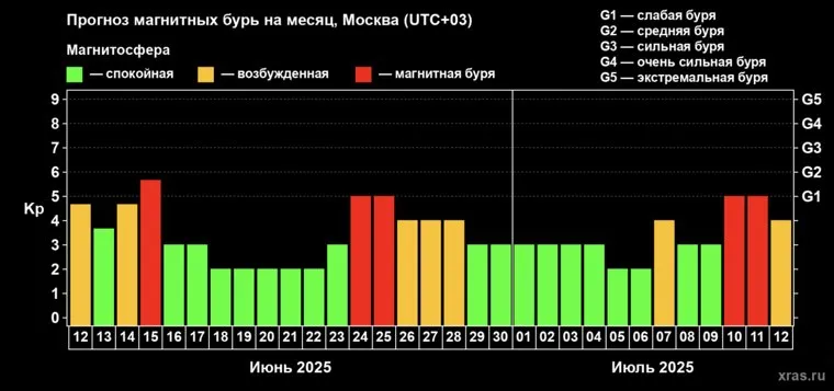 Нельзя исключать и вероятность магнитных бурь. Пик геомагнитной активности, по предварительному прогнозу, ожидается на 15 число, но 13 июня риск шторма также возрастет — его оценивают в 36%.