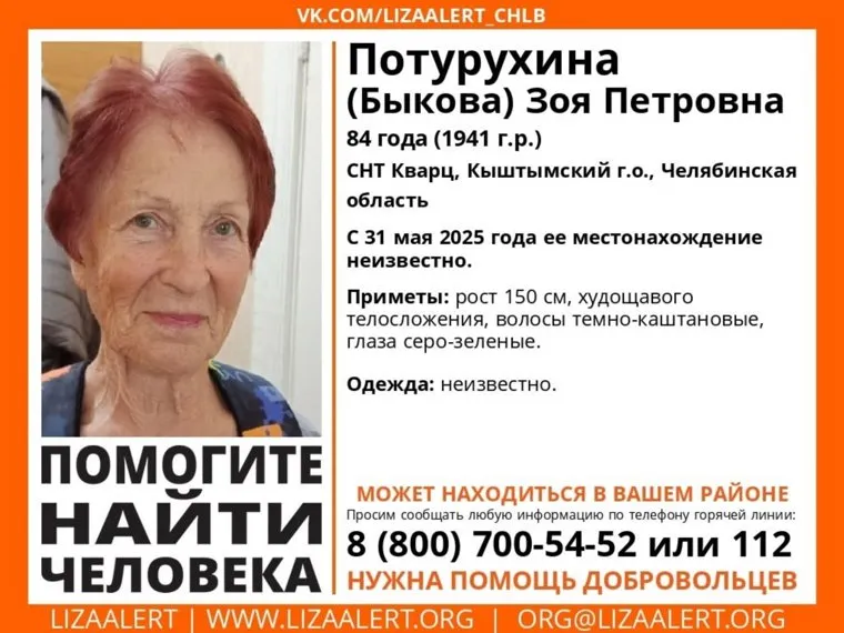 «Внимание! Помогите найти человека. Потурухина (Быкова) Зоя Петровна, 84 года (1941 г.р.). Ушла из СНТ „Кварц“, Кыштымский городской округ, Челябинская область. С 31 мая 2025 года ее местонахождение неизвестно», — говорится в сообщении поискового отряда «ЛизаАлерт».