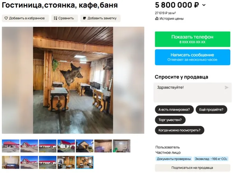 «Продается придорожный комплекс „Берлога“. В него входит: кафе, гостиница, баня и стоянка. Цена: 5 800 000 рублей», — говорится в сообщении.