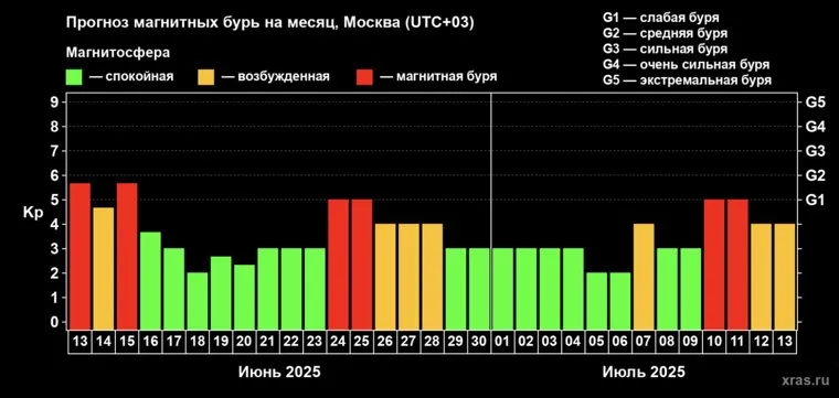 В июле, по предварительному прогнозу, буря ожидается 10-11 числа. 7, 12 и 13 июля ученые прогнозируют повышенную геомагнитную активность. Стоит помнить, что прогноз на такой дальний срок может оказаться неточным — поэтому метеозависимым людям лучше заранее проверять, чего ждать от геомагнитной активности в ближайшие несколько дней.