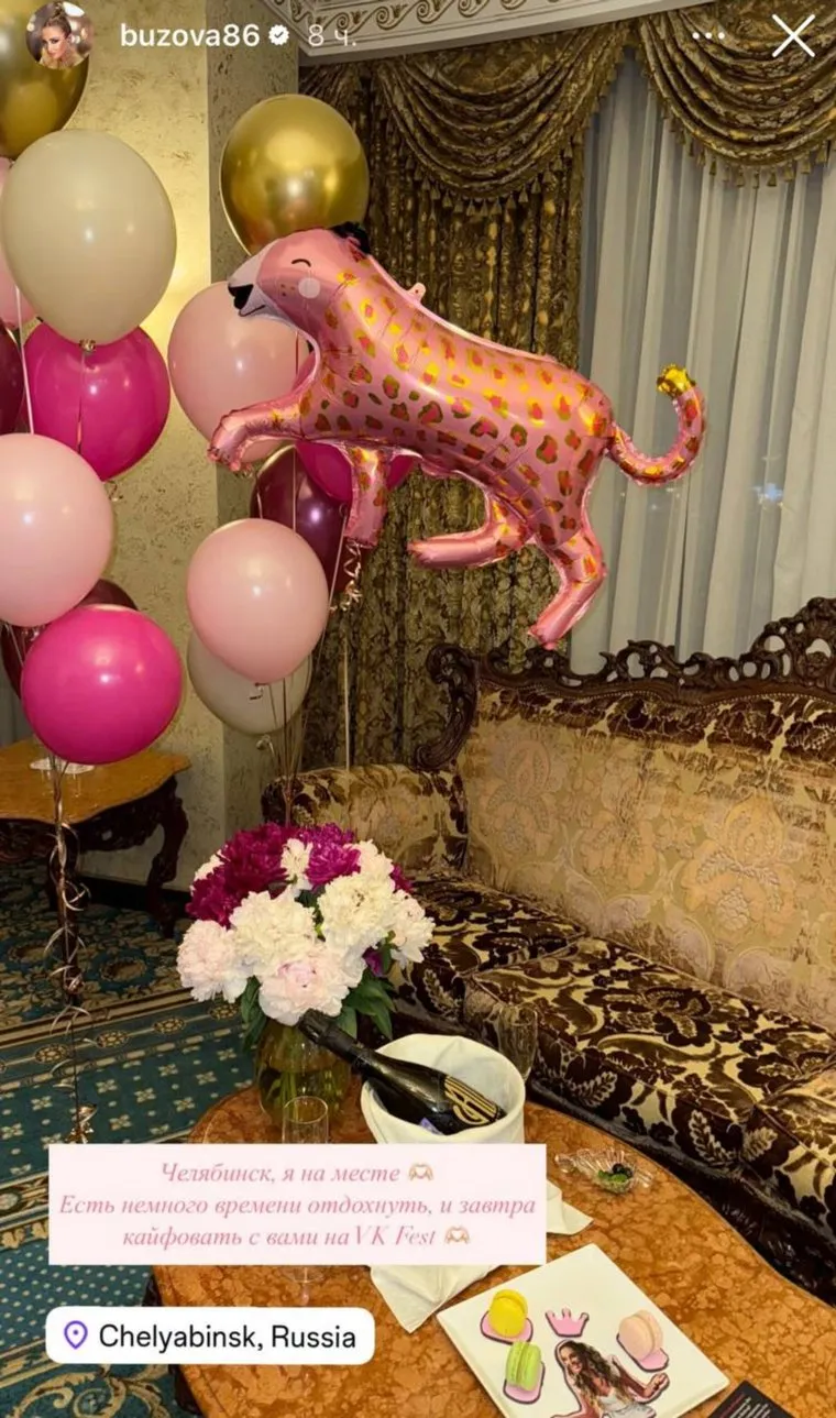 Также Ольга Бузова прикрепила фотографию номера. На журнальном столике гостье оставили цветы, французские пирожные, бутылку шампанского. Комнату украсили надувными шарами, один из которых в форме розового леопарда.